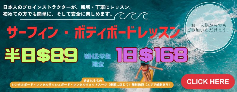 レッスンは、サーフィンオーストラリア公認コーチとコンディションに合わせてビーチを移動、参加者のレベルに応じたメニューを作成いたしますので、個々のレベルに合った練習内容でレッスンに参加出来ます。